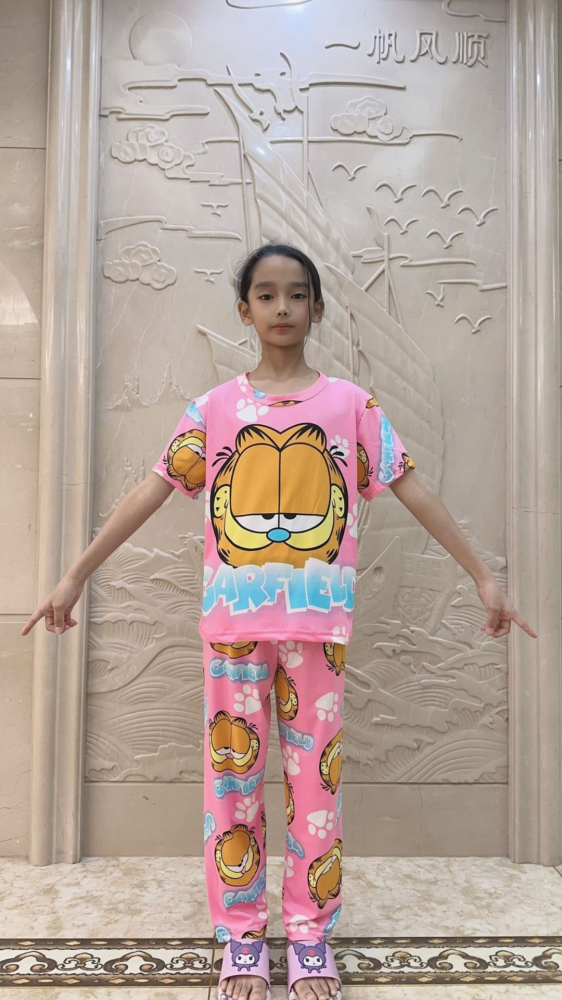 • البنطال متناسق مع التيشيرت، حيث يتميز بنفس اللون الوردي ورسومات مكررة لنفس الشخصية مع آثار أقدام، مما يجعل التصميم متكاملًا وأنيقًا.