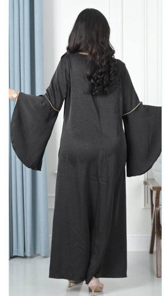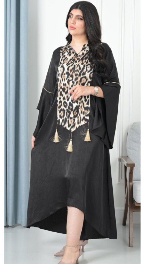 جلابيه سوداء أنيقة بتصميم عصري، تتوسطها لوحة أمامية بنقشة النمر تضفي لمسة جريئة وجذابة. تتميز بياقة على شكل V وشراشيب ذهبية تضيف طابعًا فاخرًا. الأكمام واسعة تمنح حرية في الحركة، بينما القصّة المتناسقة تجعلها مريحة للارتداء. قماش خفيف ويلائم مختلف المناسبات، ويمكن تنسيقها مع إكسسوارات باللون الذهبي لإكمال الإطلالة بلمسة فخامة.