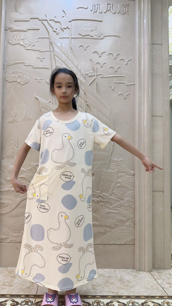 روب منزلي باللون الأوف وايت مع طبعات بط ظريفة ودوائر باللون الأزرق الفاتح. يتميز بقصة مريحة وأكمام قصيرة، مع جيب جانبي لإضافة لمسة عملية.