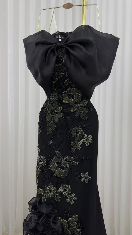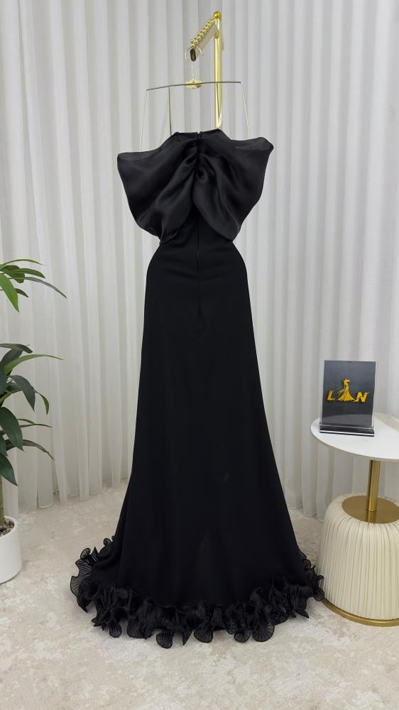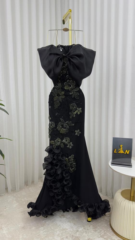 فستان "سحر الغموض" هو تحفة فنية تمزج بين الجرأة الكلاسيكية والجاذبية المعاصرة. يأتي باللون الأسود الملكي الذي يعكس الفخامة، ويُزيَّن من الأعلى بفيونكة ضخمة تضفي لمسة درامية أنيقة تعانق منطقة الصدر بأسلوب جذّاب وملفت
