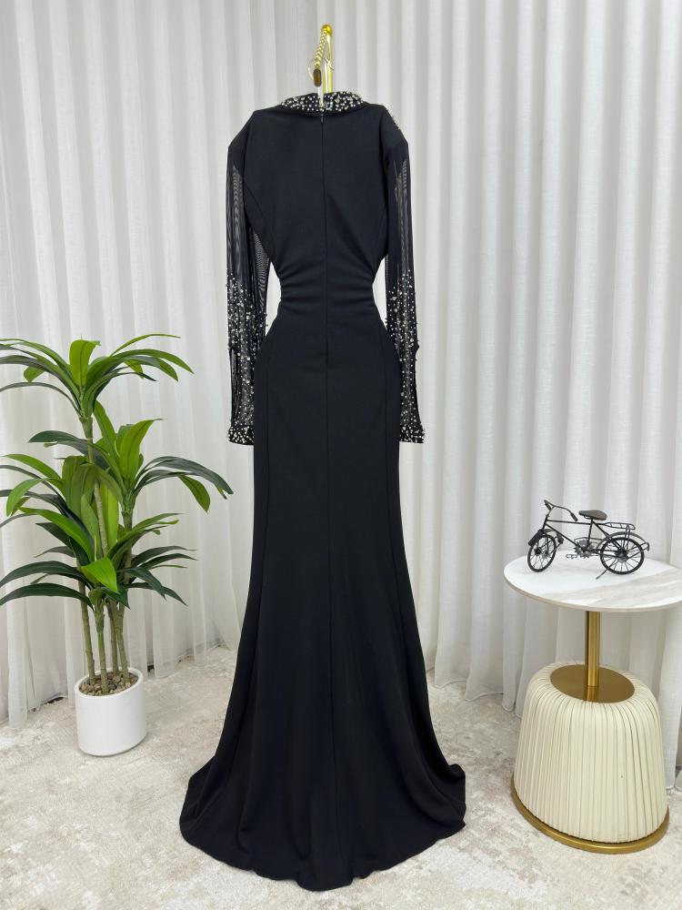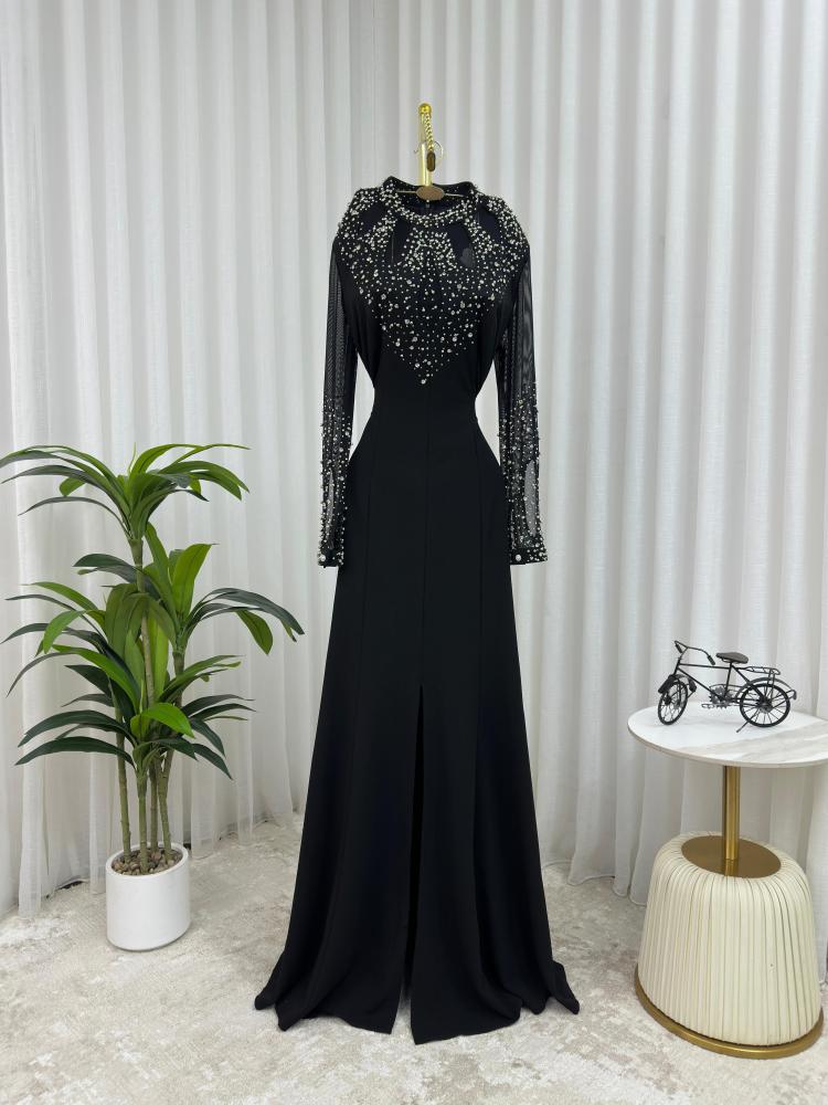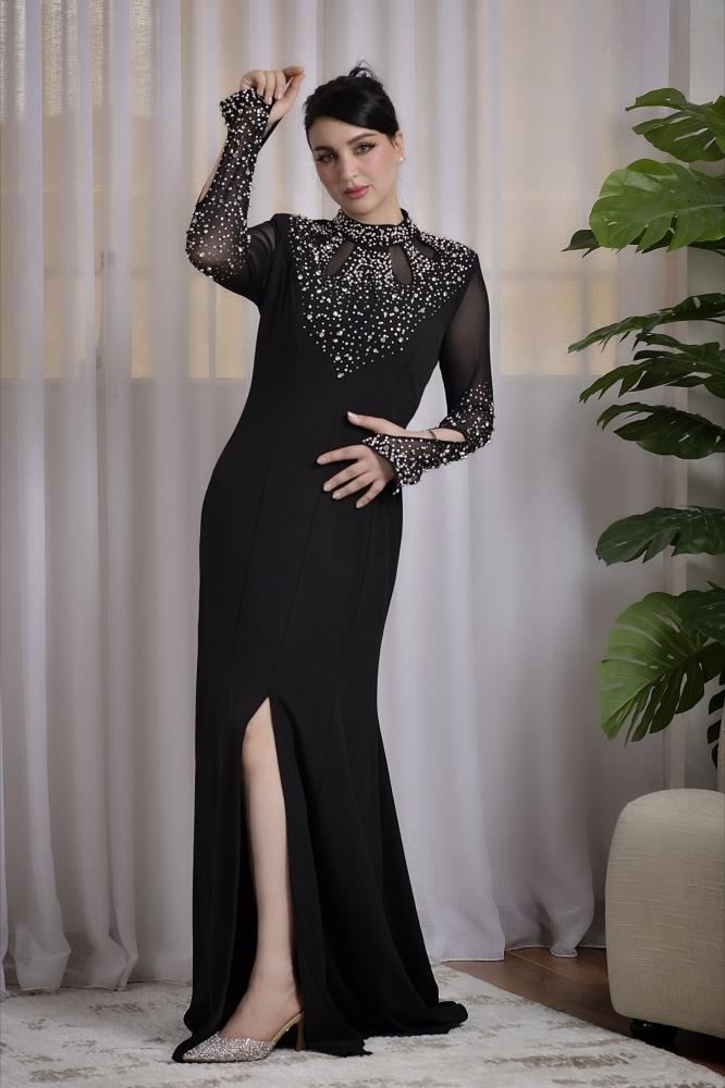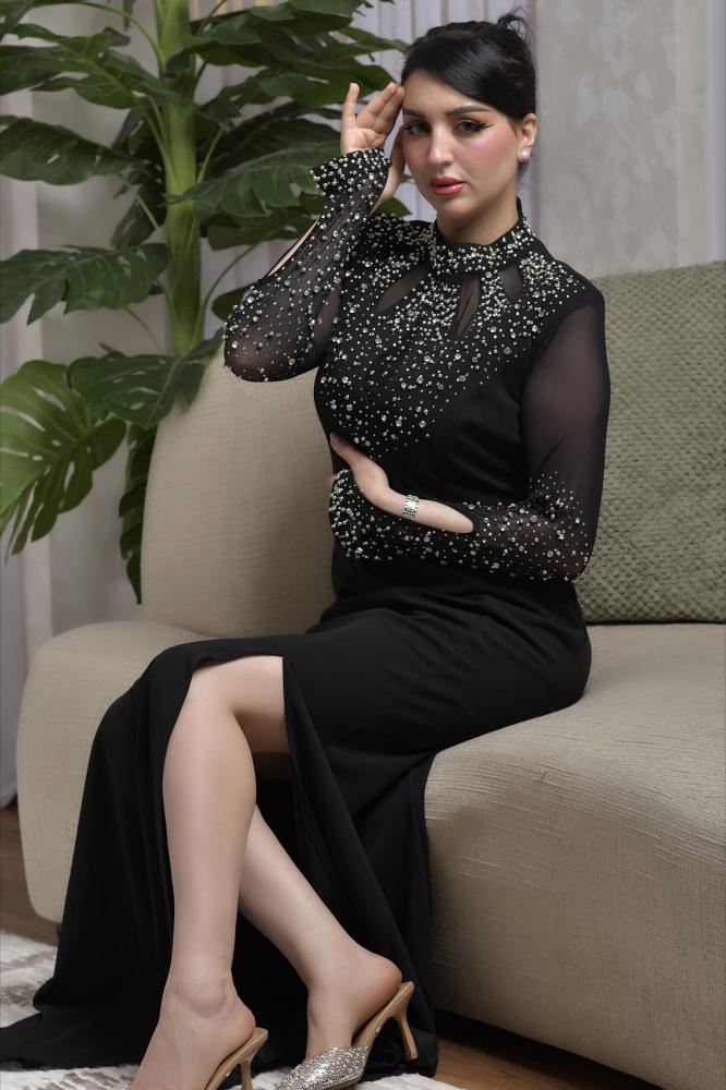 يُجسّد فستان "سحر الليل" الفخامة الكلاسيكية بلمسة عصرية جذابة، بتصميم أنيق باللون الأسود الملكي الذي لا يخرج عن الموضة أبدًا. يتميز الفستان بقصة ضيقة تُبرز جمال القوام، مع تنورة طويلة تنسدل بانسيابية وتفتح بشق أمامي أنيق لإضفاء لمسة جريئة وراقية.