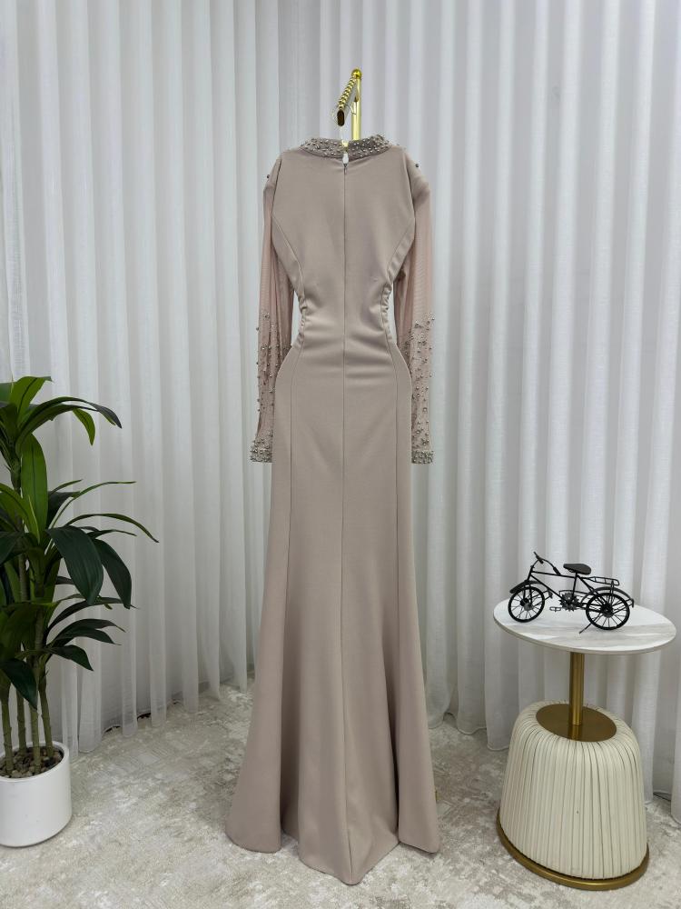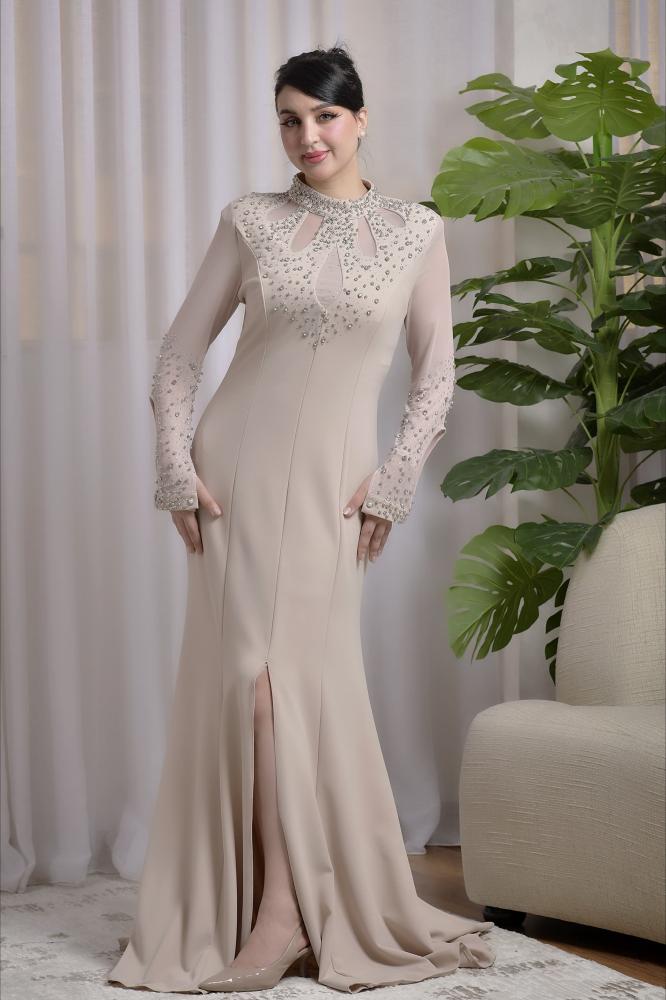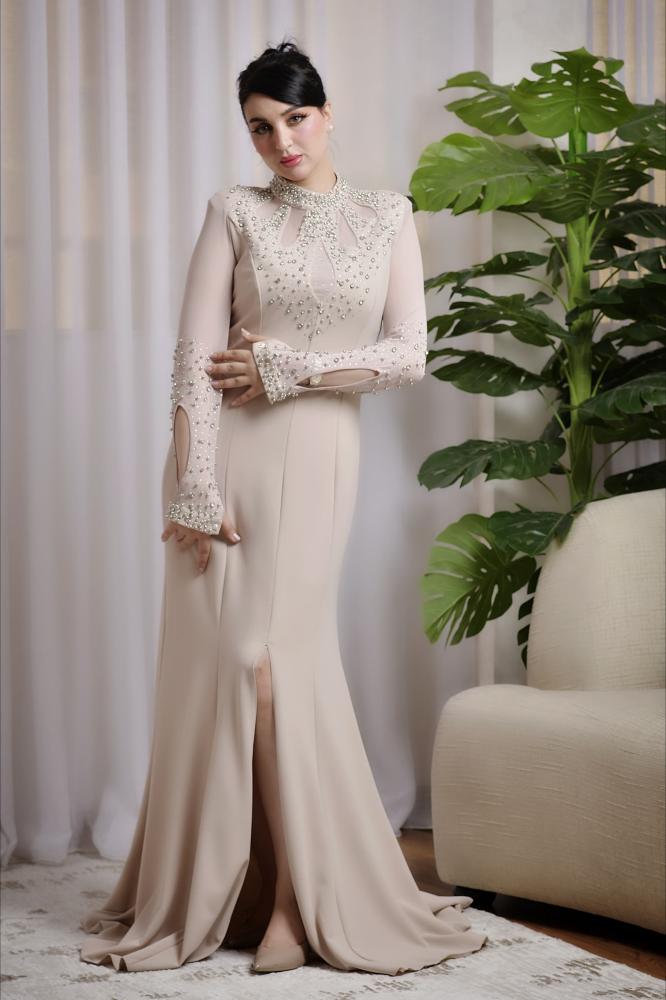 فستان "ضوء القمر" هو تجسيد للرقي والنعومة، يتميز بلونه البيج المائل إلى الوردي الفاتح الذي يعكس إحساسًا بالأنوثة والهدوء. صُمم بقصة ضيقة تُبرز الخصر بشكل أنيق، مع تنورة طويلة تنساب برقي وتحتوي على شق أمامي ناعم يضفي لمسة من الجاذبية الراقية.