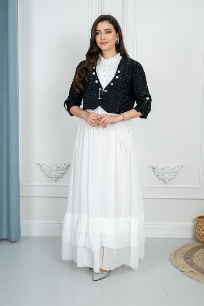 فستان أبيض ملكي مع جاكيت أنيق مرصع