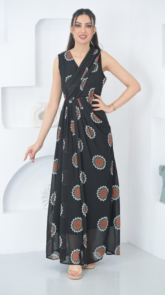 الفستان طويل (ماكسي) باللون الأسود، خفيف وذو قصة بدون أكمام. يتميز بنقوش دائرية أو شبيهة بالورود بألوان برتقالية وبنية وبيضاء موزعة على كامل القماش.