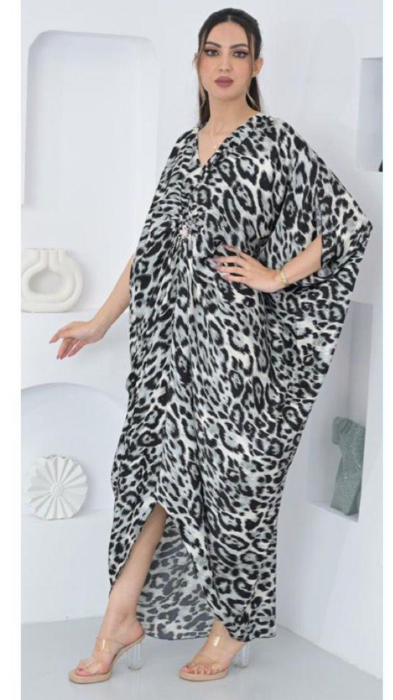 فستان طويل بنقشة النمر بدرجات الأبيض والرمادي والأسود، يتميز بقصّة واسعة وكمّين فضفاضين على طراز الكفتان. فتحة العنق على شكل V مع شدّة خفيفة عند منطقة الصدر تضفي لمسة أنثوية ناعمة. يُظهر التصميم الأمامي قصّة أقصر قليلًا من الخلف، ما يمنح الإطلالة حيوية وعصرية. القماش خفيف ومريح، مناسب للمناسبات النهارية أو المسائية على حدّ سواء.