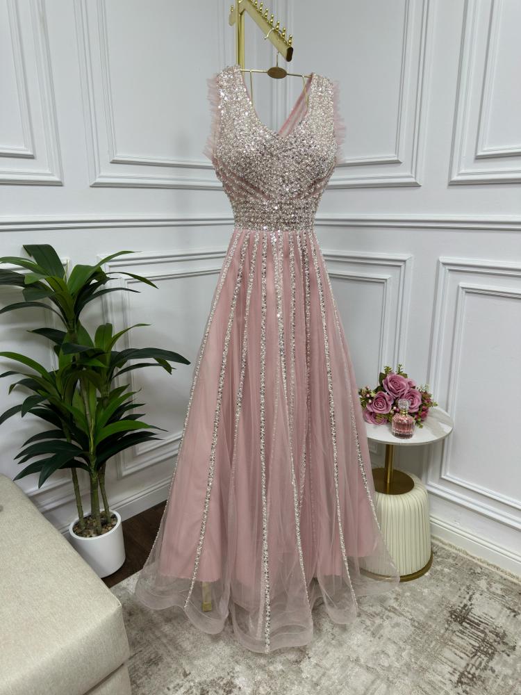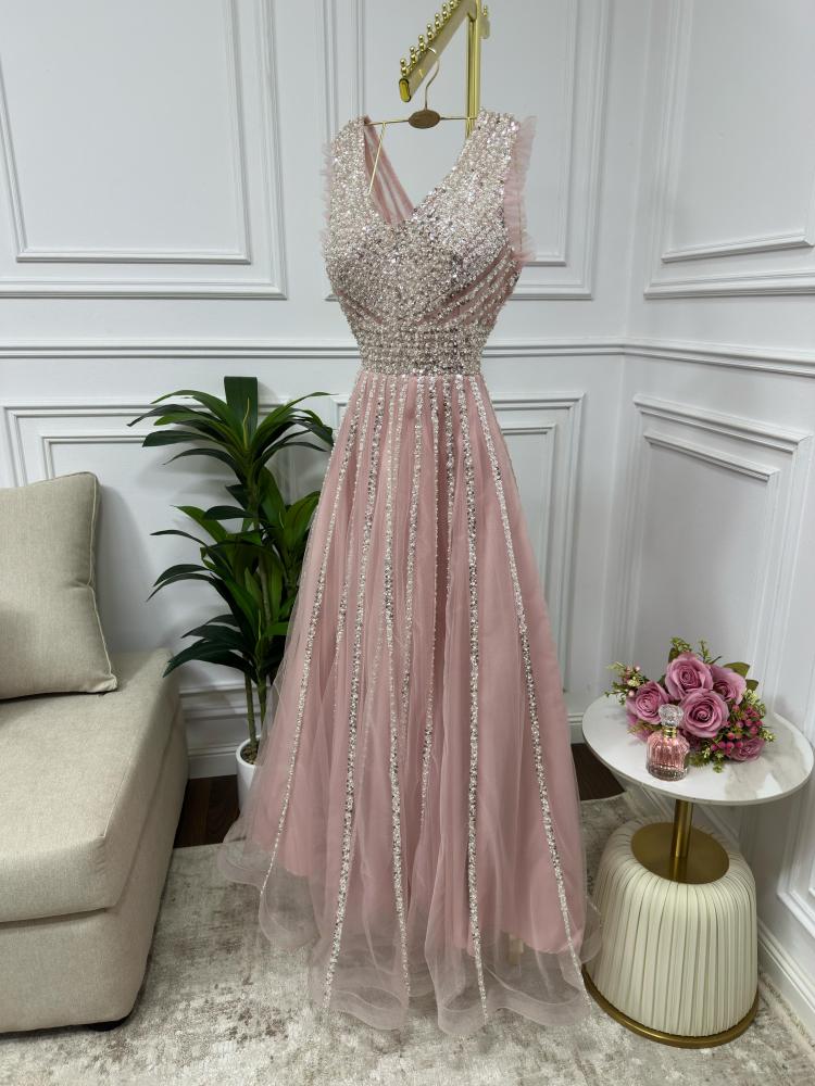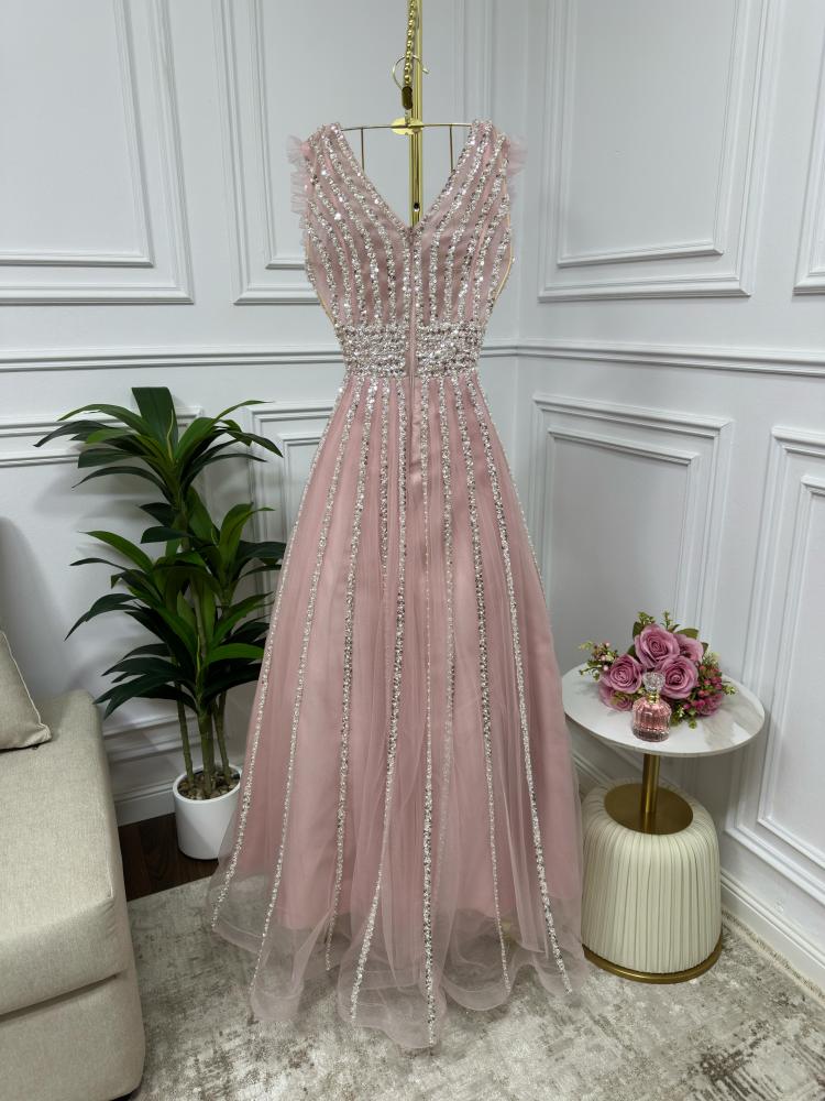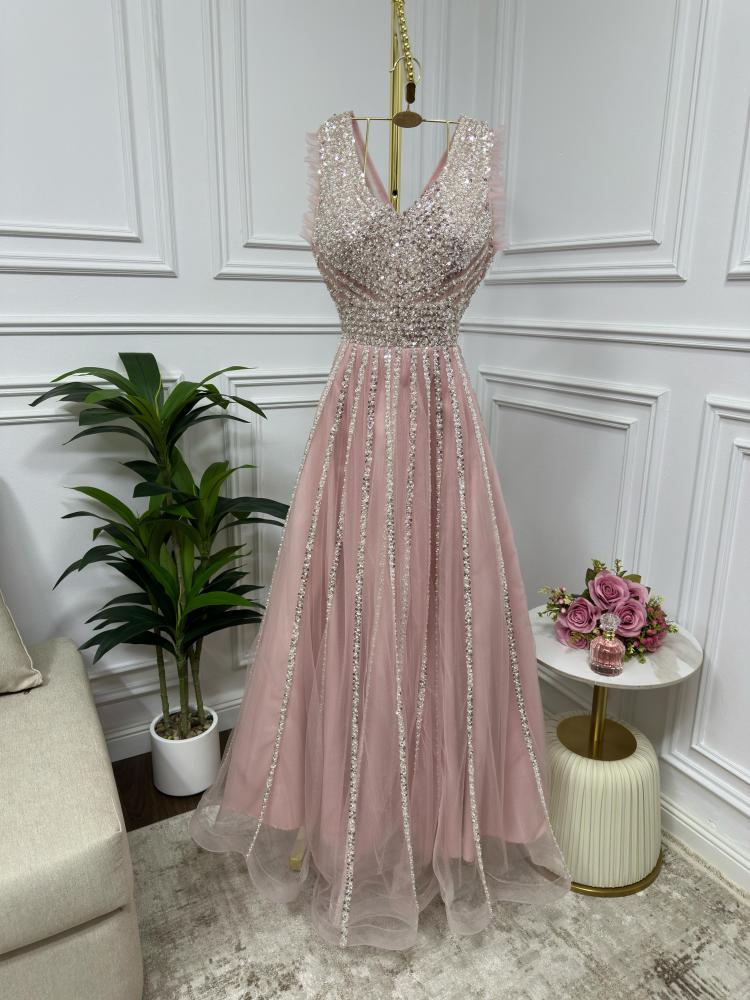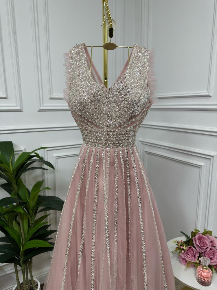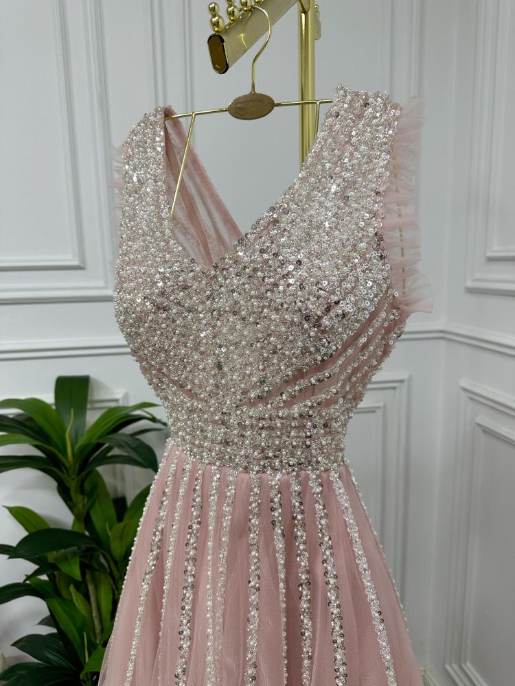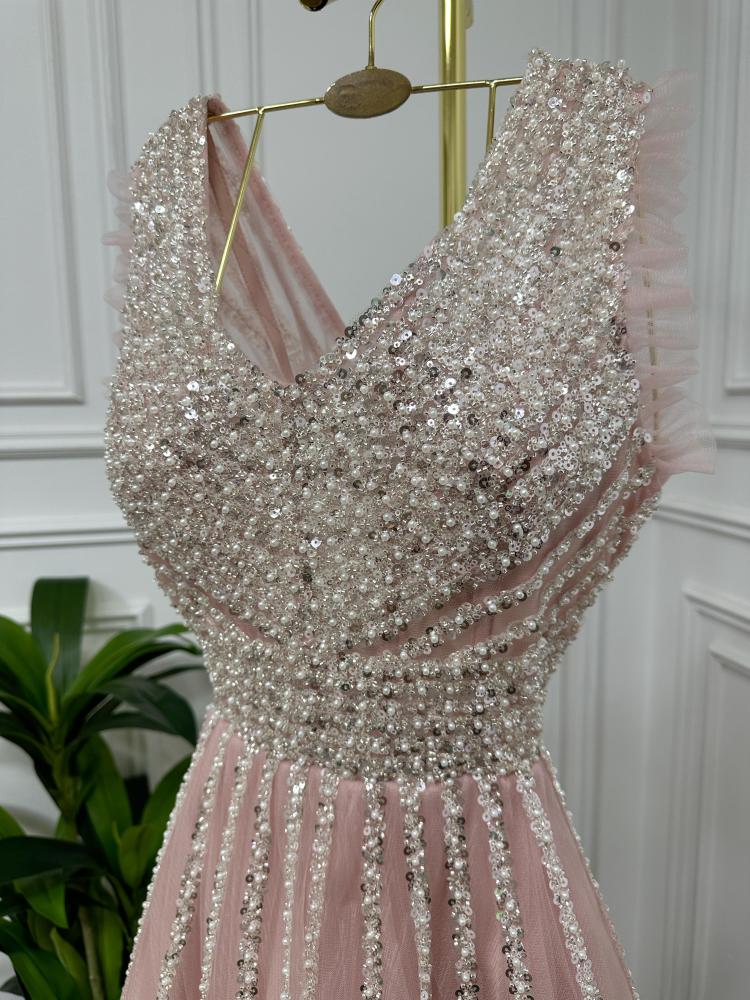 فستان ناعم بلون وردي سكري أنثوي، يفيض بالفخامة والرقة في آنٍ واحد. يتميز بتطريز فاخر من الكريستالات اللامعة على كامل الصدر والخصر، بتصميم يمنح الجسم تحديداً جذاباً وأناقة ملكية. التنورة مصممة من التول الشفاف الخفيف، مزينة بخطوط طولية مرصعة تضيف لمسة بصرية فاخرة وانسيابية جذابة عند الحركة. قصة الكتف مكشوفة بحواف تول ناعمة، تعزز من الإطلالة الرومانسية الحالمة.