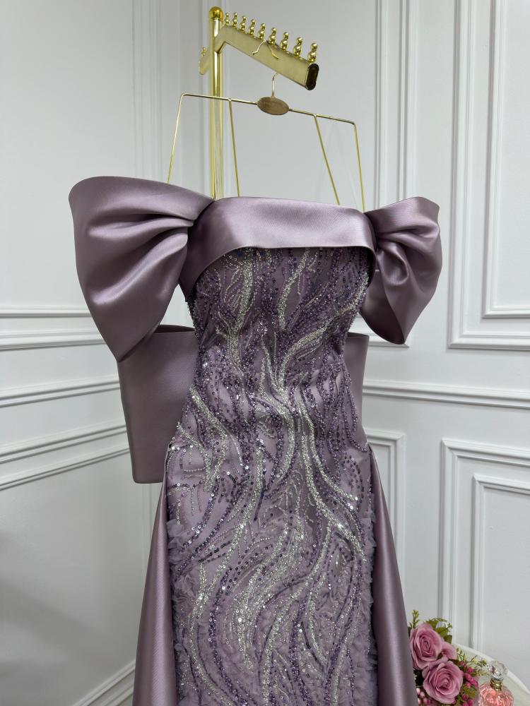فستان فخم بلون بنفسجي مائل للرمادي بتصميم ملكي يخطف الأنظار، يجمع بين الأناقة الكلاسيكية والتفاصيل العصرية الفريدة. يتميز بقصة ضيقة تُبرز جمال القوام، مع تطريزات فاخرة على شكل موجات لامعة تنساب على الصدر وحتى التنورة، تضفي عليه بريقاً فاخراً. الأكتاف مزينة بفيونكات ضخمة جذابة من الساتان تضيف لمسة درامية أنيقة، بينما تنسدل جوانب الفستان كوشاح طويل فاخر يمنح إطلالة ملوكية ساحرة.
