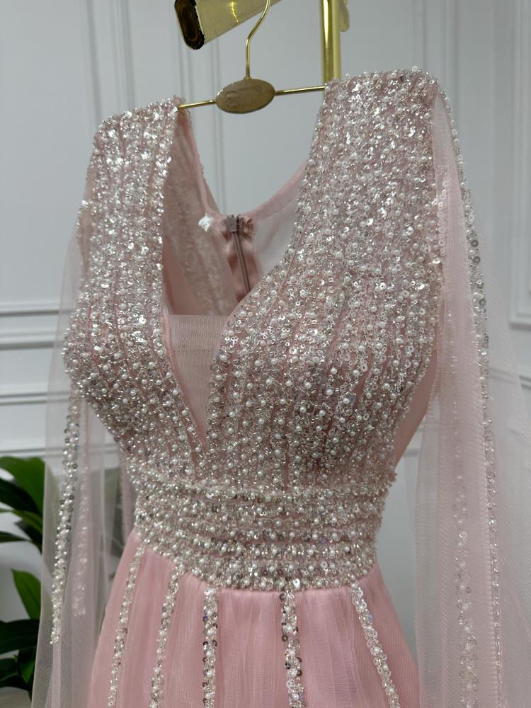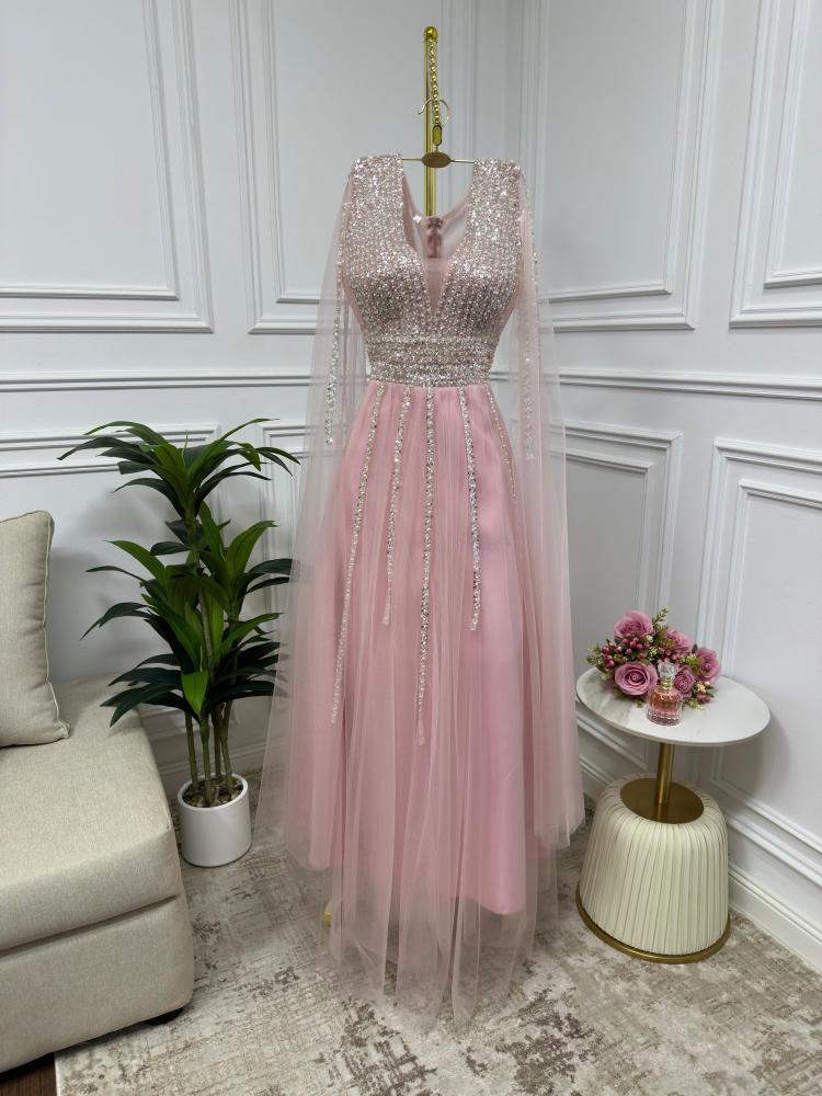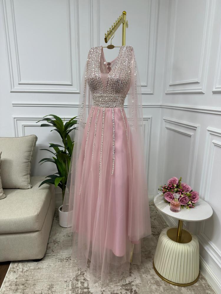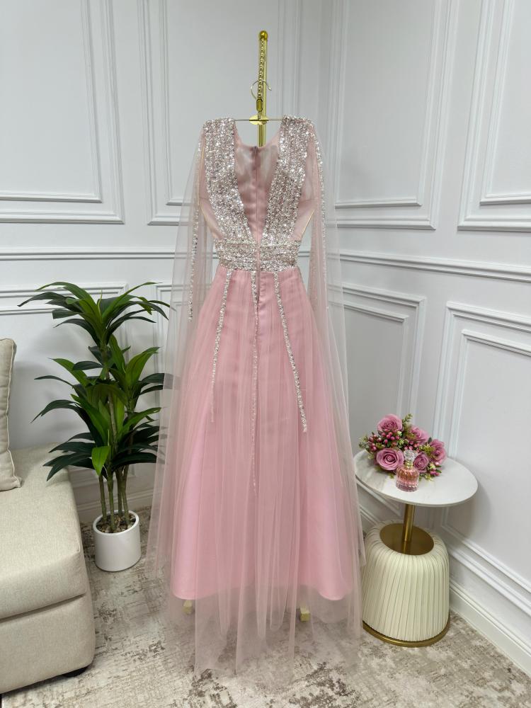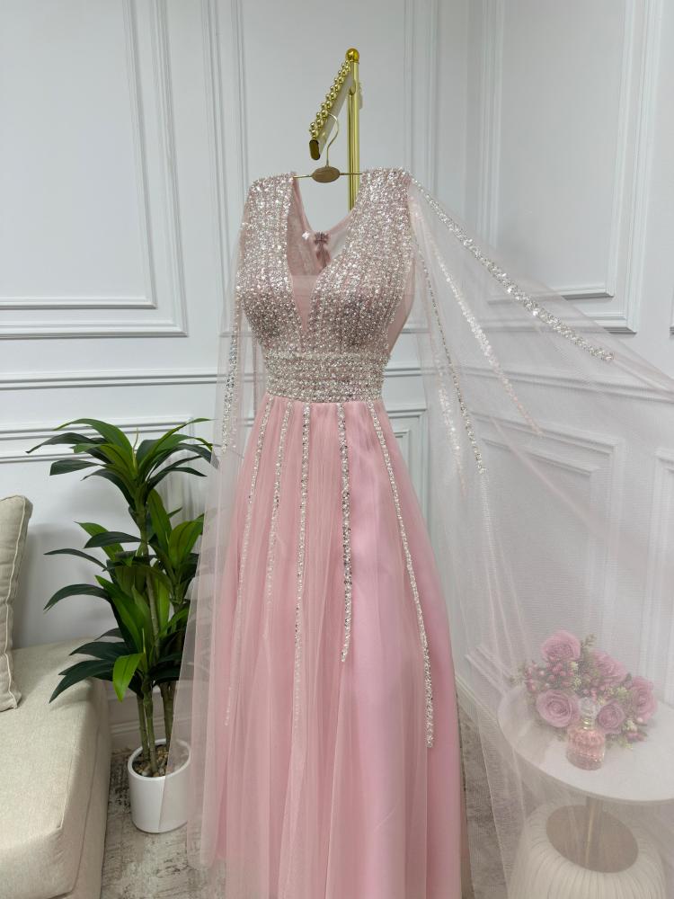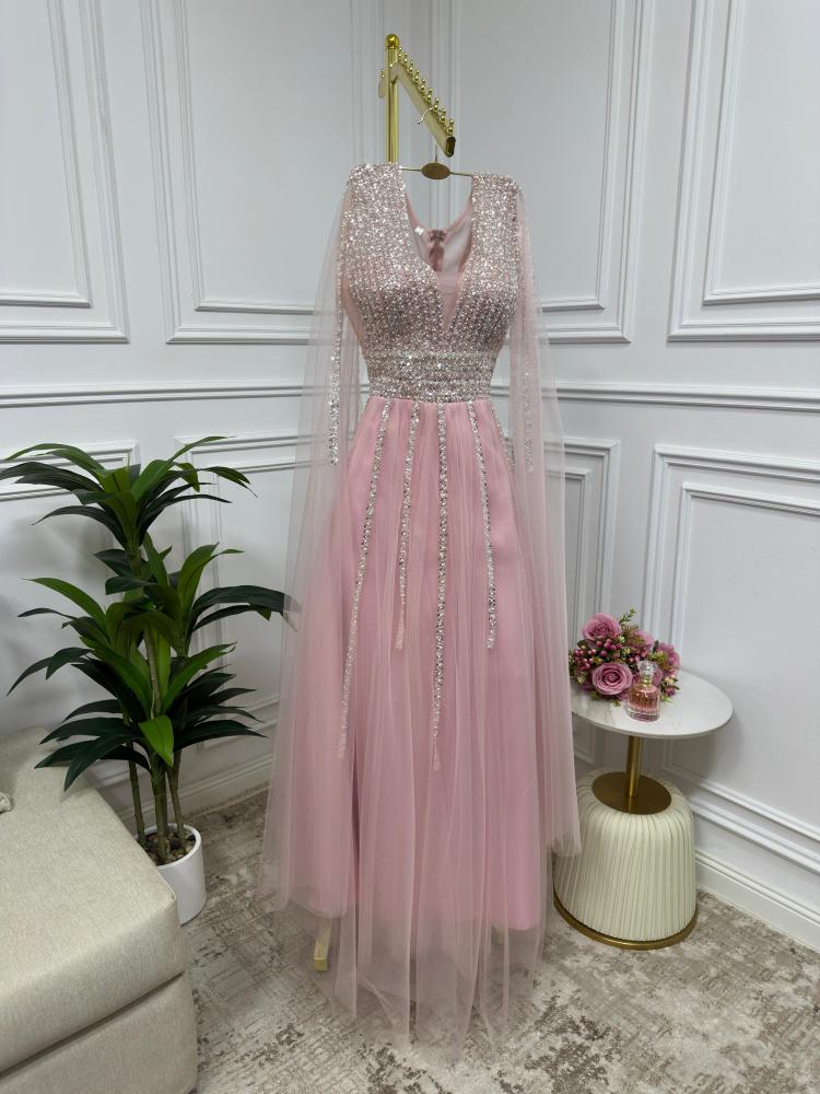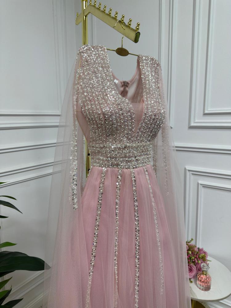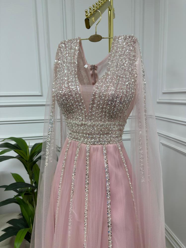 فستان أنثوي ناعم بلون وردي دافئ مستوحى من لحظات الغروب الحالمة، يتميز بتصميم راقٍ يجمع بين الرقة والتفاصيل الفخمة. الجزء العلوي مزين بالكامل بالترتر والكريستال الفضي المتلألئ بخطوط طولية تُبرز جمال القوام، مع ياقة V تضفي لمسة جذابة ومتوازنة. الأكمام تأتي على شكل كاب طويل من التول الشفاف، تضيف انسيابية وأناقة ناعمة. التنورة مصنوعة من التول الخفيف بطبقات شفافة تنساب برقة مع الحركة، ما يمنح الفستان طابعاً حالماً ورقيقاً.
