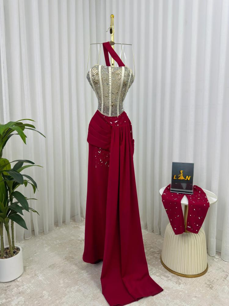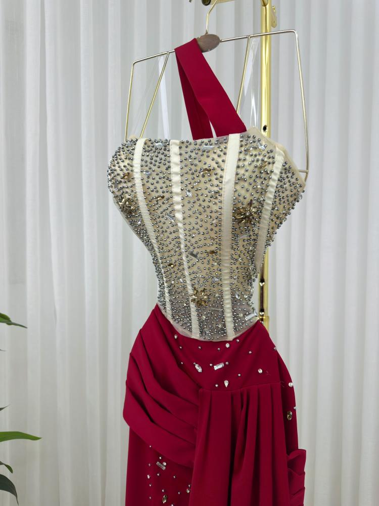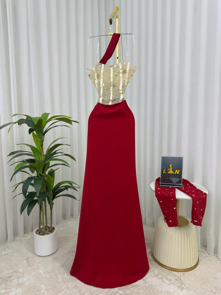 فستان "لهيب الأناقة" هو مزيج مثالي من الجرأة والرقي، بتصميم ملفت باللون الأحمر الملكي مع لمسات ذهبية براقة في الجزء العلوي. يتميز الفستان بقصة أنيقة بكتف واحد، حيث تتصل تنورته الطويلة بانسيابية راقية مع كورسيه شفاف مزيّن بخطوط عمودية من الترتر الذهبي المتلألئ، مما يعزز من إبراز شكل الجسم بشكل فاخر.