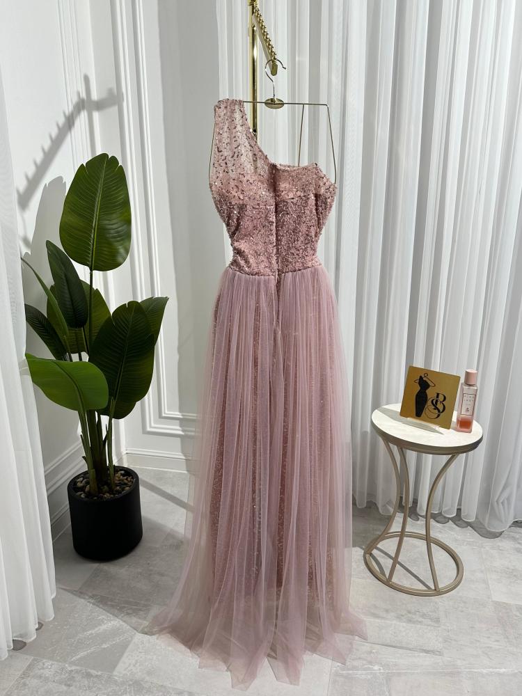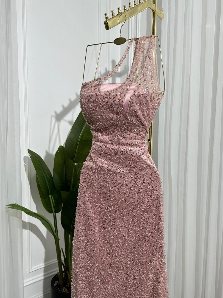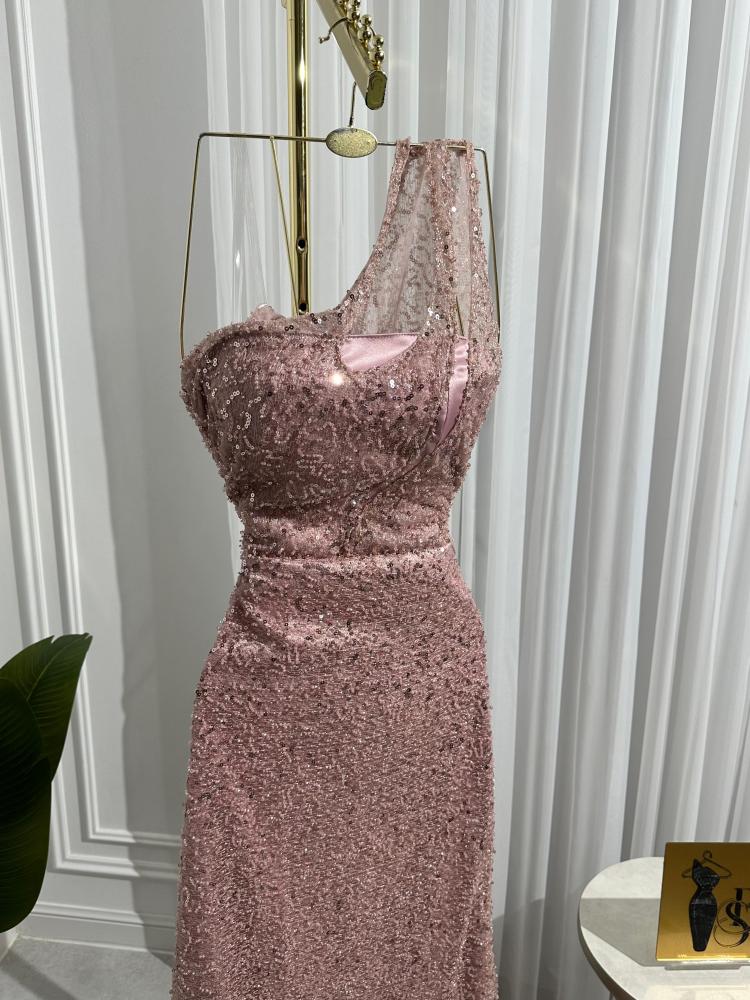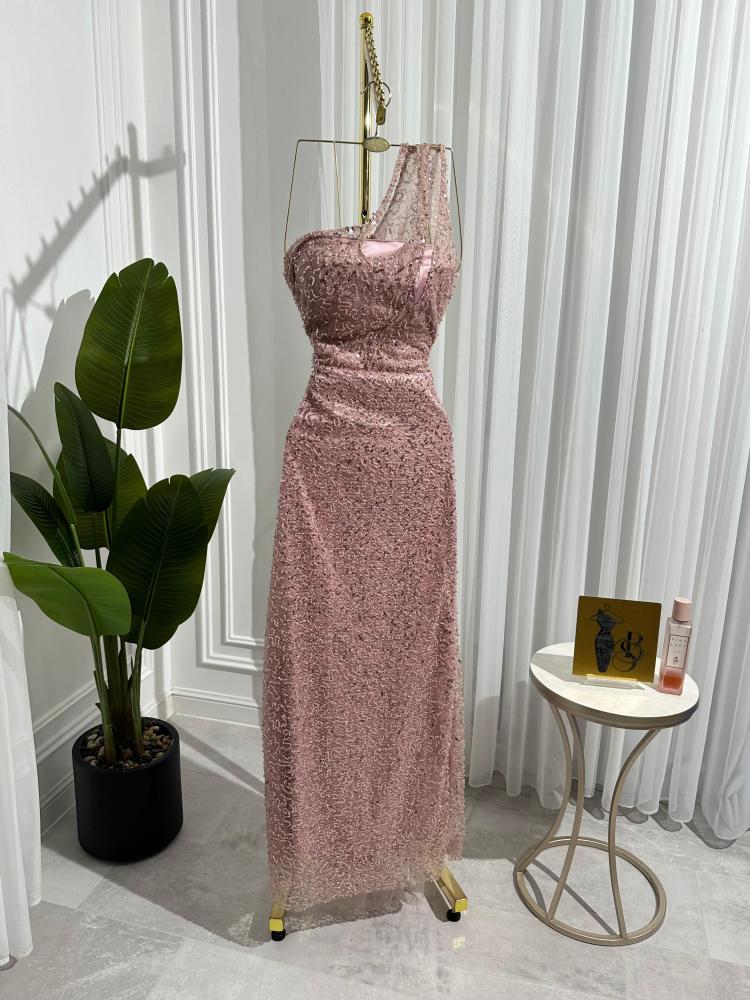 فستان "همسة وردية" هو عنوان للرقة والأنوثة الناعمة، بتصميم أنيق بلون وردي هادئ مزدان بتفاصيل براقة تضفي عليه لمسة من الفخامة. يأتي بتصميم بكتف واحد، حيث ينسدل قماش شفاف مطرز على الكتف ليمنح الفستان طابعًا ساحرًا ومميزًا.